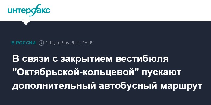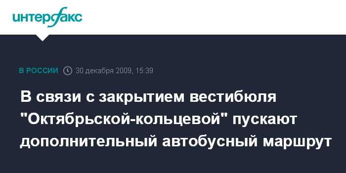 Москва. 30 декабря. INTERFAX.RU - В связи с закрытием вестибюля станции "Октябрьская" Кольцевой линии московского метро на реконструкцию и заменой эскалатора будет запущен дополнительный автобусный маршрут, сообщили "Интерфаксу" в среду в пресс-службе метрополитена. "Со 2 января 2010 года вестибюль станции "Октябрьская-кольцевая" закрывается на реконструкцию", - напомнили там.