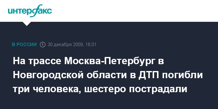 Москва. 30 декабря. INTERFAX.RU – В Новгородской области на трассе "Москва - Санкт-Петербург" в среду днем в дорожно-транспортном происшествии погибли три человека, сообщили "Интерфаксу" в областном ГИБДД.