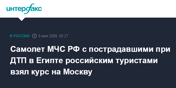 Москва. 5 мая. ИНТЕРФАКС - Из Египта в Россию вылетел самолет МЧС РФ Як-42, который доставит на родину девять россиян, пострадавших в ДТП.