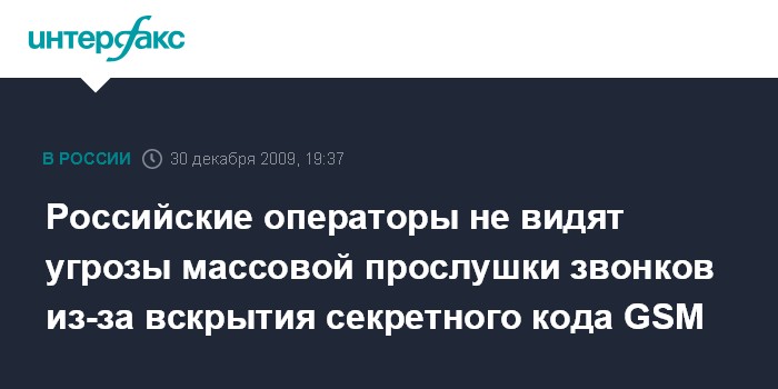 Москва. 30 декабря. INTERFAX.RU – Сотовые операторы "большой тройки" не считают, что раскрытие алгоритма шифрования звонков в сетях GSM создает риск массового перехвата и расшифровки телефонных переговоров.
