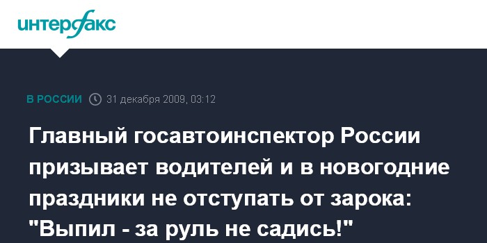 Москва. 31 декабря. ИНТЕРФАКС - Российская Госавтоинспекция предостерегает водителей от употребления спиртного в новогодние праздники.