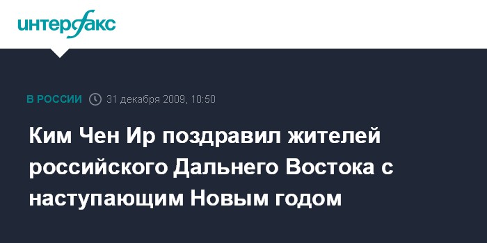 Москва. 31 декабря. INTERFAX.RU - Лидер Северной Кореи Ким Чен Ир поздравил дальневосточников с Новым Годом и Рождеством, сообщили агентству "Интерфакс-Дальний Восток" в полпредстве президента рФ в Дальневосточном федеральном округе. "В предновогодние дни полномочный представитель президента РФ в Дальневосточном федеральном округе Виктор Ишаев получил поздравления с Новым Годом и Рождеством от ряда руководителей стран Азиатско-Тихоокеанского региона, глав российских министерств и ведомств, губернаторов краев и областей Дальнего Востока, председателей Советов директоров крупных российских компаний", - сказали в полпредства.
