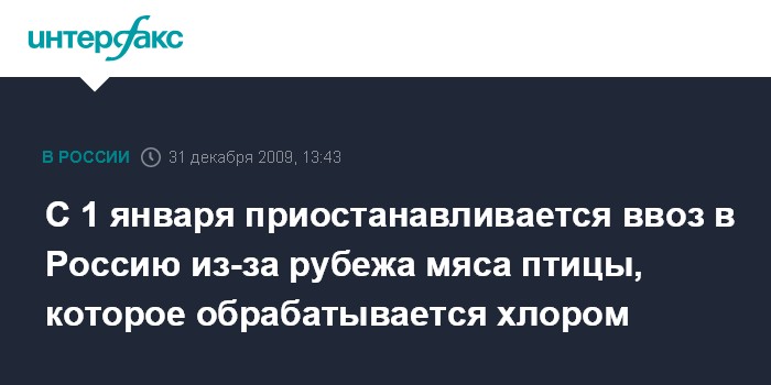 Москва. 31 декабря. INTERFAX.RU - Российская санитарная служба с 1 января 2010 года приостанавливает действие санитарно-эпидемиологических заключений на мясо птицы, которое ввозится из-за рубежа и при переработке обрабатывается хлором. Соответствующее постановление подписал глава Роспотребнадзора, главный государственный санитарный врач РФ Геннадий Онищенко, сообщили "Интерфаксу" в пресс-службе ведомства.