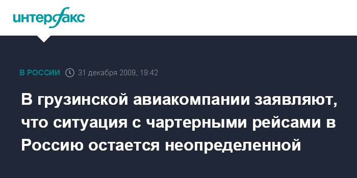 Ранее в четверг в Минтрансе РФ "Интерфаксу" сообщили, что это ведомство разрешило грузинской авиакомпании Georgian Airwas выполнить чартерные полеты 8, 9 и 10 января по маршруту Тбилиси-Москва-Тбилиси, а также 9 и 10 января по маршруту Тбилиси-Санкт-Петербург-Тбилиси. Воздушное сообщение между странами было прервано в августе 2008 года после начала конфликта в Южной Осетии.