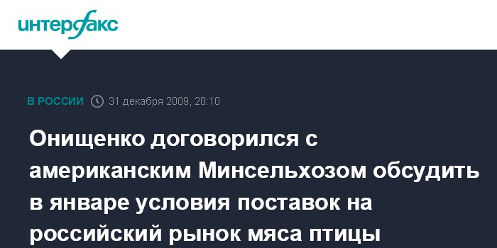 "Обсуждался вопрос о предстоящих переговорах. Скорее всего, они состоятся в Москве в середине января. Это будут переговоры об условиях выполнения американской стороной российских национальных требований по безопасной обработке мяса птицы, которое поступает на российский рынок", - сказал Г.Онищенко.