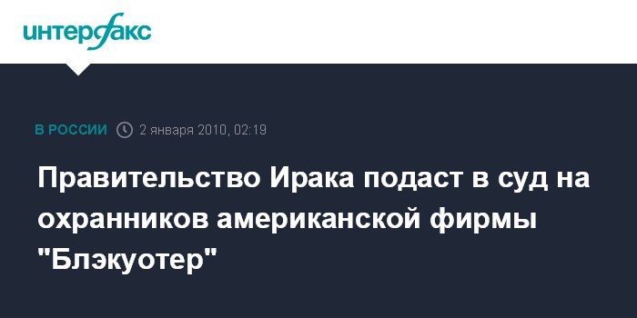 Вашингтон. 2 января. ИНТЕРФАКС - Власти Ирака протестуют против принятого в минувший вторник американским судьей решения о снятии обвинений с пятерых сотрудников охранной компании "Блэкуотер" (Blackwater), которые обвиняются в убийстве 17 мирных жителей Багдада в сентябре 2007 года.
