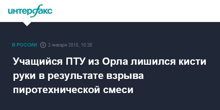 Москва. 2 января. INTERFAX.RU - В Орле учащийся среднего профессионально-технического учебного заведения серьезно пострадал 1 января в результате взрыва пиротехнической смеси, сообщил "Интерфаксу" в субботу источник в правоохранительных органах. Последствиями взрыва стали травматическая ампутация кисти руки подростка и многочисленные травмы.