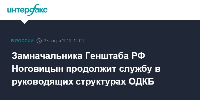 Москва. 2 января. INTERFAX.RU - Заместителя начальника Генерального штаба Вооруженных сил РФ генерал-полковника Анатолия Ноговицына планируется назначить первым заместителем начальника Объединенного штаба Организации Договора о коллективной безопасности, сообщил "Интерфаксу-АВН" военно-дипломатический источник в Москве. "Минобороны России обратилось в Секретариат ОДКБ с предложением назначить генерала Ноговицына на должность первого заместителя начальника Объединенного штаба. Эта кандидатура сейчас проходит согласование в военных ведомствах государств-членов Организации", - сказал собеседник агентства. При этом, полагает он, "поскольку данная должность закреплена за российской стороной, а также, учитывая значительный опыт генерал-полковника Ноговицына, сомнений в утверждении его практически нет".