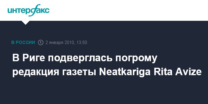 Москва. 2 января. INTERFAX.RU - В ночь на субботу в Риге неизвестными разгромлены помещения редакции газеты Neatkariga Rita Avize. Как сообщила BNS главный редактор газеты Анита Даукште (Anita Daukste), в ночь на субботу, после того, как очередной номер газеты был сдан в типографию, злоумышленники проникли в помещения предприятия Mediju nams. Они разгромили кабинет главного редактора газеты и помещения рекламного отдела и бухгалтерии.