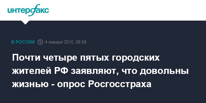 Москва. 4 января. ИНТЕРФАКС-АФИ - Удовлетворенность россиян своей жизнью заметно выросла к концу 2009 года, свидетельствуют результаты опросов, проведенных Центром стратегических исследований "Росгосстраха" в последние месяцы перед Новым годом.