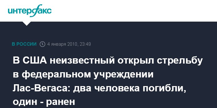 Вашингтон. 4 января. ИНТЕРФАКС - Два федеральных служащих получили ранения, один из них - смертельное, в понедельник утром, когда неизвестный открыл стрельбу в вестибюле здания федерального суда в Лас-Вегасе (штат Невада) в США, сообщила американская телекомпания Си-эн-эн.