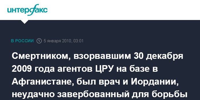 Лондон. 5 января. ИНТЕРФАКС - Смертник, взорвавший в самом конце декабря 2009 года восемь сотрудников ЦРУ в Афганистане, являлся двойным агентом, сообщила в понедельник ночью британская телерадиокорпорация Би-би-си со ссылкой на источники в США.