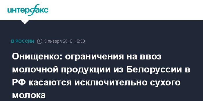 Онищенко: ограничения на ввоз молочной продукции из Белоруссии в РФ касаются исключительно сухого молока