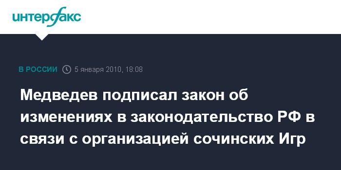 Москва. 5 января. INTERFAX.RU - Президент России Дмитрий Медведев подписал федеральный закон "О внесении изменений в отдельные законодательные акты Российской Федерации в связи с организацией и проведением XXII Олимпийских зимних игр и XI Паралимпийских зимних игр 2014 года в городе Сочи и развитием города Сочи как горноклиматического курорта". Закон был принят Государственной Думой 23 декабря 2009 г. и одобрен Советом Федерации 25 декабря 2009 года, сообщает во вторник пресс-служба Кремля.