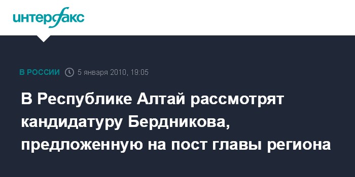 Горно-Алтайск. 5 января. INTERFAX.RU - Госсобрание Республики Алтай - Эл Курултай рассмотрит кандидатуру Александра Бердникова, внесенную президентом России Дмитрием Медведевым на пост главы республики, на внеочередной сессии 12 января. Для того, чтобы вопрос о наделении А.Бердникова полномочиями главы региона был решен положительно, необходимо, чтобы "за" проголосовали большинство депутатов, сообщили агентству "Интерфакс-Сибирь" в Госсобрании. "У нас 41 депутат, значит, "за" должен проголосовать 21 депутат", - отметил собеседник агентства.