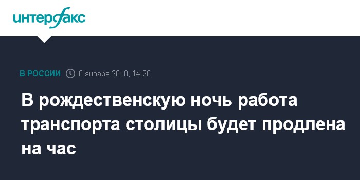 Москва. 6 января. INTERFAX.RU - Столичное метро и наземный общественный транспорт в рождественскую ночь будут работать на час дольше обычного. Как сообщили "Интерфаксу" в горадминистрации, в связи с проведением в московских храмах богослужений, московская подземка будет работать на вход до 2.00, при этом наземный общественный транспорт продлит свою работу до 3.00. "В остальные дни до окончания новогодних каникул 10 января общественный транспорт будет работать в режиме выходного дня", - добавили там.