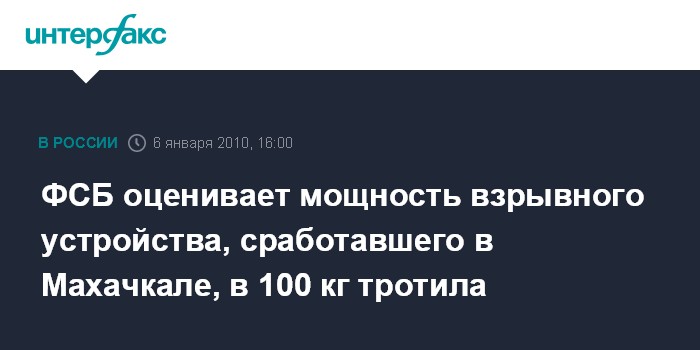 Махачкала. 6 января. INTERFAX.RU - Мощность взрыва у базы батальона ДПС в Махачкале оценивается в 100 кг в тротиловом эквиваленте, сообщили "Интерфаксу" в пресс-службе УФСБ РФ по Дагестану. По данным УФСБ, во взорвавшейся автомашине находились артиллерийские 122 и 125-мм снаряды, их фрагменты найдены при осмотре места происшествия. По уточненным данным, в результате взрыва погибли пять сотрудников милиции и террорист-смертник, ранения различной степени тяжести получили 19 человек. Повреждены порядка 100 единиц личного и служебного автотранспорта, находившегося на территории базы и рядом с ней. В радиусе 200 метров выбиты стекла в зданиях.