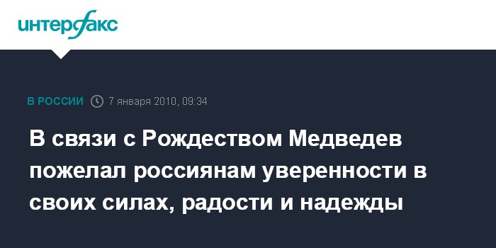 "Рождество - время добрых помыслов и дел. Пусть свет этого праздника всегда сопровождает вас, придаёт уверенность в своих силах, дарит радость и надежду", - пожелал Д. Медведев.