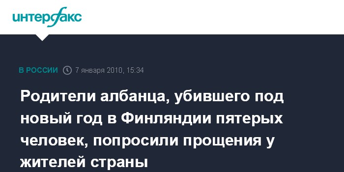 Хельсинки. 7 января. INTERFAX.RU - Родители проживавшего в Финляндии албанца Ибрагима Шкуполли, убившего 31 декабря пятерых граждан страны и покончившего затем с собой, попросили прощения у жителей страны за поступок своего сына.