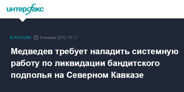 "В том, что касается бандитов, наша политика остается прежней. Их нужно просто уничтожать, делать это жестко и делать это систематически, то есть регулярно, потому что, к сожалению, бандподполье еще существует", - сказал Д.Медведев в ходе встречи с директором ФСБ Александром Бортниковым.