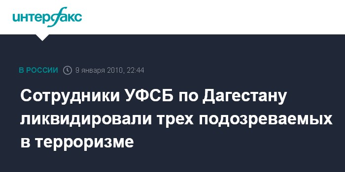 Махачкала. 9 января. ИНТЕРФАКС-ЮГ - Трое подозреваемых в участии в НВФ ликвидированы в ходе оперативно-боевого мероприятия, проведенного сотрудниками УФСБ РФ по Дагестану недалеко от Махачкалы.