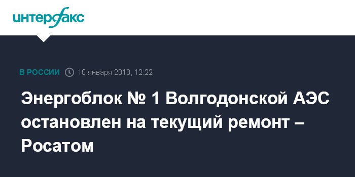 Ростов-на-Дону. 10 января. INTERFAX.RU - Энергоблок № 1 Волгодонской АЭС (Ростовская область) остановлен в 9:20 мск в воскресенье на текущий ремонт. "Предварительная причина - неплотность трубчатой системы парогенератора", - сообщили агентству "Интерфакс-Юг" в пресс-службе Росатома. По словам собеседника агентства, по предварительной оценке, ремонт потребуется трое-четверо суток.