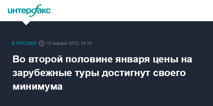 Москва. 10 января. INTERFAX.RU - С середины января до начала февраля на туристическом рынке наступает период минимального спроса, и, соответственно, самых низких цен на зарубежные туры, сообщает портал "Интерфакс-Туризм" со ссылкой на туроператоров. По словам Ларисы Смирновой, коммерческого директора туркомпании "Джет Трэвел", в среднем цены на туры после новогодних праздников падают на 60%, а на отдельных курортах - на все 100% за счет снижения стоимости проживания в отелях, апартаментах и пансионах. "Вообще, одна из самых выгодных за весь год дат для зарубежной поездки - середина января", - добавила собеседница агентства. Вопреки расхожему мнению, как заметил другой эксперт рынка, распродажи в полном объеме начинаются в Европе не перед Рождеством и не после него, а с 6 января и длятся до начала февраля. "Это - самый выгодный период для покупки одежды, обуви, товаров для дома, так как цены на них падают почти вдвое", - сказал он.