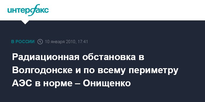 Москва. 10 января. INTERFAX.RU - Радиационная обстановка в районе Волгодонской АЭС не вызывает опасений, сообщил "Интерфаксу" в воскресенье руководитель Роспотребнадзора, главный государственный санитарный врач РФ Геннадий Онищенко. "Замеры, которые мы постоянно проводим в контрольных точках после остановки энергоблока Волгодонской АЭС, показывают, что радиационный уровень соответствует норме и не превышает естественного фона", - сказал он. По словам Г.Онищенко, радиационная обстановка в норме по всему периметру АЭС и в городе Волгодонск. "Никаких оснований для тревоги нет", - подчеркнул он.