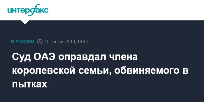 Лондон. 10 января. INTERFAX.RU - Член правящей королевской семьи ОАЭ шейх Исса бин Заед аль-Найян оправдан по всем пунктам обвинений в том, что он пытал своего бывшего партнера по бизнесу из Афганистана, сообщает Би-би-си. Состоявшийся в Абу-Даби процесс над шейхом вызвал широкий общественный резонанс после того, как в интернете появилось видео, на котором было видно, как мужчину бьют, жгут и переезжают машиной. Однако председательствовавший судья отверг все обвинения. По словам адвоката шейха, суд принял во внимание, что обвиняемый находился под влиянием медикаментов и не отдавал себе отчета в своих действиях.