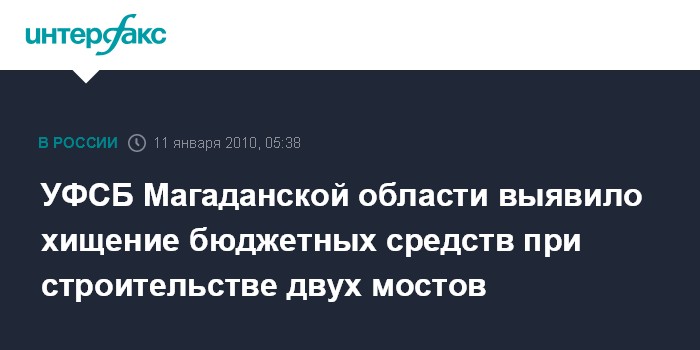 Магадан. 11 января. ИНТЕРФАКС - ДАЛЬНИЙ ВОСТОК - Сотрудники Управления ФСБ России по Магаданской области вскрыли схему хищения бюджетных средств, выделенных на строительство и ремонт мостов, расположенных на федеральной автомобильной дороге "Колыма".