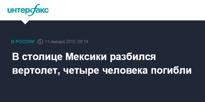 Москва. 11 января. INTERFAX.RU - Не менее четырех человек расстались с жизнью в столице Мексики в результате крушения вертолета, сообщает в понедельник агентство ЭФЭ.