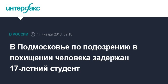 "8 января в дежурную часть обратилась 56-летняя жительница Подмосковья, которая сообщила о том, что от дома 119, расположенного в поселке Дружба-2, неизвестные похитили ее 17-летнего сына, студента московского колледжа, и потребовали за его освобождение выкуп в размере 2 млн рублей", - рассказал собеседник агентства.