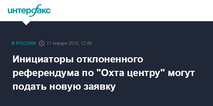 Москва. 11 января. INTERFAX.RU - Инициативная группа петербуржцев, которым Законодательное собрание города отказало в проведении референдума по поводу строительства "Охта центра", скорее всего, подаст новую заявку в Горизбирком. "Вероятнее всего, будет новая заявка с учетом замечаний", - сказал "Интерфаксу" в понедельник один из инициаторов референдума, лидер городского отделения партии "Яблоко" Максим Резник. По его словам, точное решение о дальнейших действиях инициаторов будет приниматься на совещании в четверг.