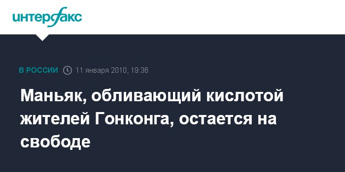 Вашингтон. 11 января. ИНТЕРФАКС - Преступник, обливающий кислотой жителей Сянгана (Гонконга), до сих пор остается на свободе, сообщил в понедельник американский телеканал CNN.