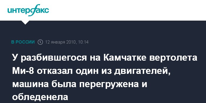 Москва. 12 января. INTERFAX.RU - По предварительным данным, причиной аварии вертолета Ми-8Т "Корякского авиапредприятия" на Камчатке в конце декабря 2009 года мог стать отказ левого двигателя.