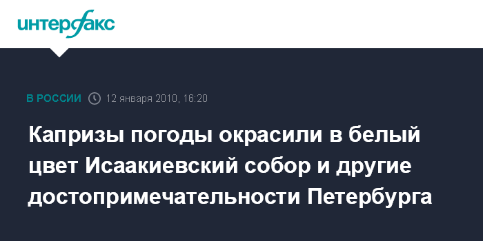 Москва. 12 января. INTERFAX.RU - Исаакиевский собор Петербурга и другие архитектурные достопримечательности Петербурга во вторник из-за капризов погоды окрасились в белый цвет. Как передал корреспондент "Интерфакса", знаменитая колоннада Исаакиевского собора стала матового белого цвета, покрывшись инеем. В такой же оттенок окрасился портик, верхняя балюстрада и фигуры ангелов, украшающие собор. Издалека создается впечатление, что собор сменил привычные темные тона на полностью белый окрас.