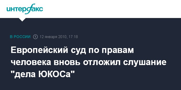 Москва. 12 января. INTERFAX.RU - Слушания по делу российской компании "ЮКОС" в Европейском суде по правам человека перенесены на 4 марта, сообщила во вторник пресс-служба ЕСПЧ. "Слушания перенесены на 4 марта в связи с невозможностью (присутствия - ИФ) российского судьи по этому делу и представителя правительства России", - отмечает пресс-служба ЕСПЧ.