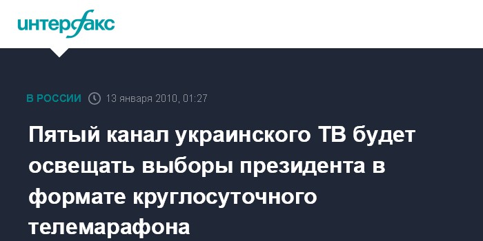 Киев. 13 января. ИНТЕРФАКС-УКРАИНА - Украинский Пятый канал намерен в день выборов президента Украины работать 24 часа подряд - с 8.00 (разница с Москвой - плюс 1 час - ИФ) воскресения, 17 января, до 8.00 понедельника, 18 января.