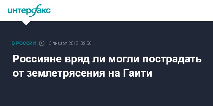 Москва. 13 января. INTERFAX.RU – Российских туристов на Гаити, скорее всего, нет, более точная информация появится через полтора часа, сообщила порталу "Интерфакс-Туризм" пресс-секретарь Российского союза туриндустрии (РСТ) Ирина Тюрина.