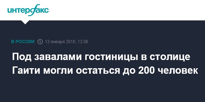 Москва. 13 января. INTERFAX.RU – Французский государственный секретарь по вопросам сотрудничества Ален Жуайанде сообщил в среду, что из-за сильного землетрясения 200 человек оказались под завалами одной из крупных гостиниц в столице Гаити, городе Порт-о-Пренс.