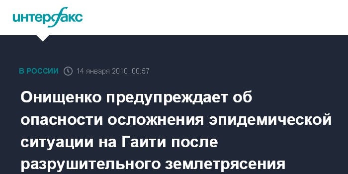 Москва. 14 января. ИНТЕРФАКС - Российская санитарная служба предупреждает об опасности эпидемических последствий разрушительного землетрясения на Гаити.