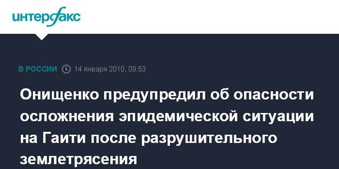 Москва. 14 января. INTERFAX.RU - Российская санитарная служба предупреждает об опасности эпидемических последствий разрушительного землетрясения на Гаити.