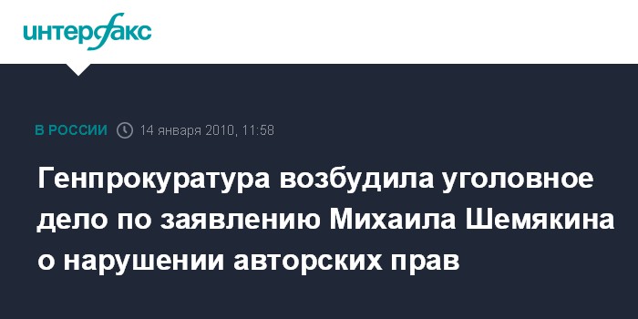 Москва. 14 января. INTERFAX.RU - По заявлению Михаила Шемякина, поданному в Генеральную прокуратуру России, возбуждено уголовное дело. Как сообщила "Интерфаксу" официальный представитель Генпрокуратуры РФ Марина Гриднева, уголовное дело возбуждено по статье "Нарушение авторских и смежных прав" УК РФ по материалам проверки, проведенной прокуратурой.