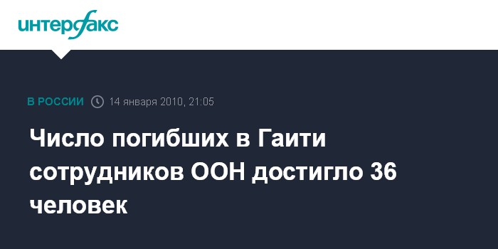 Нью-Йорк (ООН). 14 января. INTERFAX.RU - Миссия ООН в Гаити в четверг распространила новые данные о количестве жертв среди ооновского персонала. В нынешнем списке погибших 36 человек, в их числе и миротворцы, и гражданские сотрудники, сообщил представитель миссии Дэвид Вимхерст.