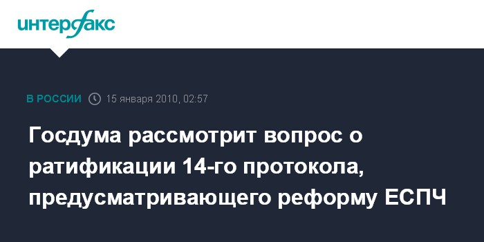 Москва. 15 января. ИНТЕРФАКС - Госдума в пятницу рассмотрит вопрос о ратификации 14-го протокола к Европейской конвенции о защите прав человека и основных свобод, предусматривающего реформу Европейского суда по правам человека (ЕСПЧ).