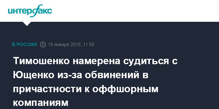 Москва. 15 января. INTERFAX.RU – Премьер-министр Украины Юлия Тимошенко подала иск в Печерский районный суд Киева в связи с распространением президентом страны Виктором Ющенко обвинений о ее причастности к оффшорным компаниям.