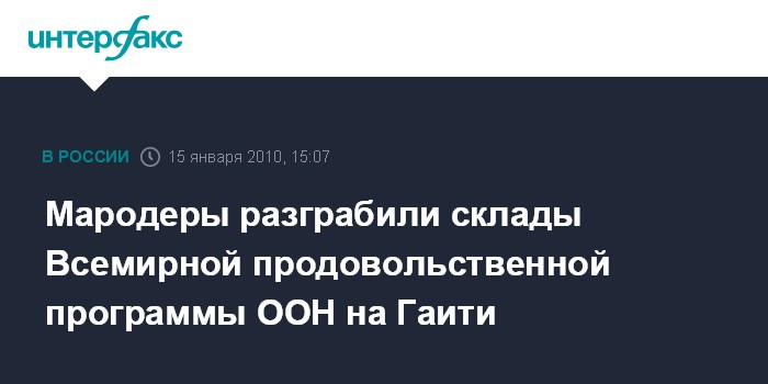 Москва. 15 января. INTERFAX.RU – Склады Всемирной продовольственной программы ООН в пострадавшей от разрушительного землетрясения столице Гаити, Порт-о-Пренсе, разграблены в пятницу мародерами, сообщает газета "Вашингтон пост" со ссылкой на заявление представителя организации Эмилии Каселлы.
