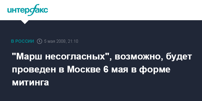 Москва. 5 мая. ИНТЕРФАКС-МОСКВА - В Москве не будет оппозиционного "Марша несогласных", который организаторы планировали в Москве на вечер 6 мая, а мэрия не санкционировала, но не исключено проведение митинга.