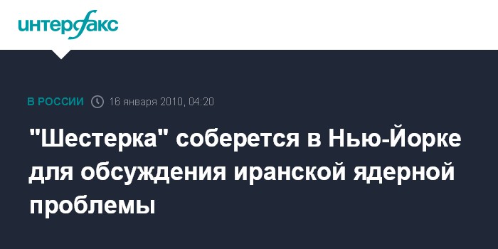 Москва. 16 января. ИНТЕРФАКС - Встреча "шестерки" международных посредников (Россия, США, КНР, Франция, Великобритания и Германия - ИФ) по урегулированию ядерной проблемы Ирана состоится в субботу в Нью-Йорке.