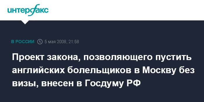 Глава комитета Госдумы по безопасности Владимир Васильев, председатель комитета по международным делам Константин Косачев и первый зампредседателя комитета по безопасности Михаил Гришанков в понедельник внесли поправки в статьи 1, 6 и 24 Федерального закона "О порядке выезда из РФ и въезда в РФ", в соответствии с которыми - в случае оперативного принятия закона - английские болельщики смогут в упрощенном порядке приехать на матч "Челси" - "Манчестер Юнайтед" 21 мая в Москву.